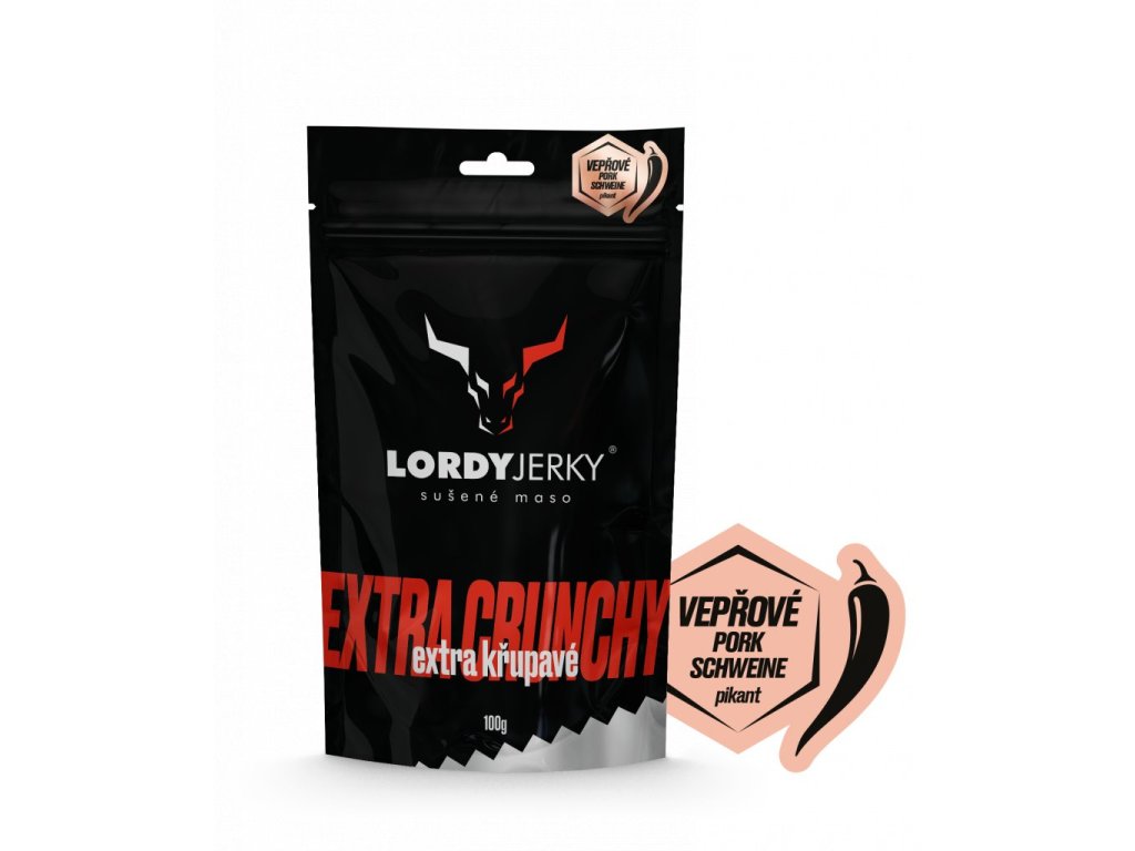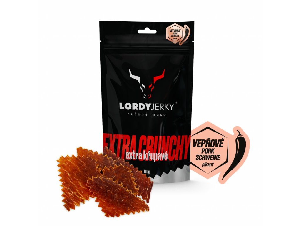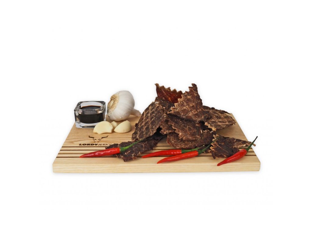 LORDYjerkyⓇ - marinované sušené bravčové mäso s chilli. Trvanlivý tepelne opracovaný mäsový výrobok.