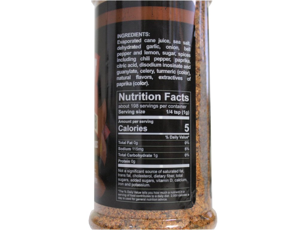 Zloženie: trstinová šťava, morská soľ, sušený cesnak, cibuľa, paprika a citrón, cukor, korenie vrátane chilli, papriky, kyselina citrónová, inozinát disodný a guanylát, zelerový prášok, kurkuma (farbivo), prírodná aróma, výťažky z papriky (farbivo) Bez lepku