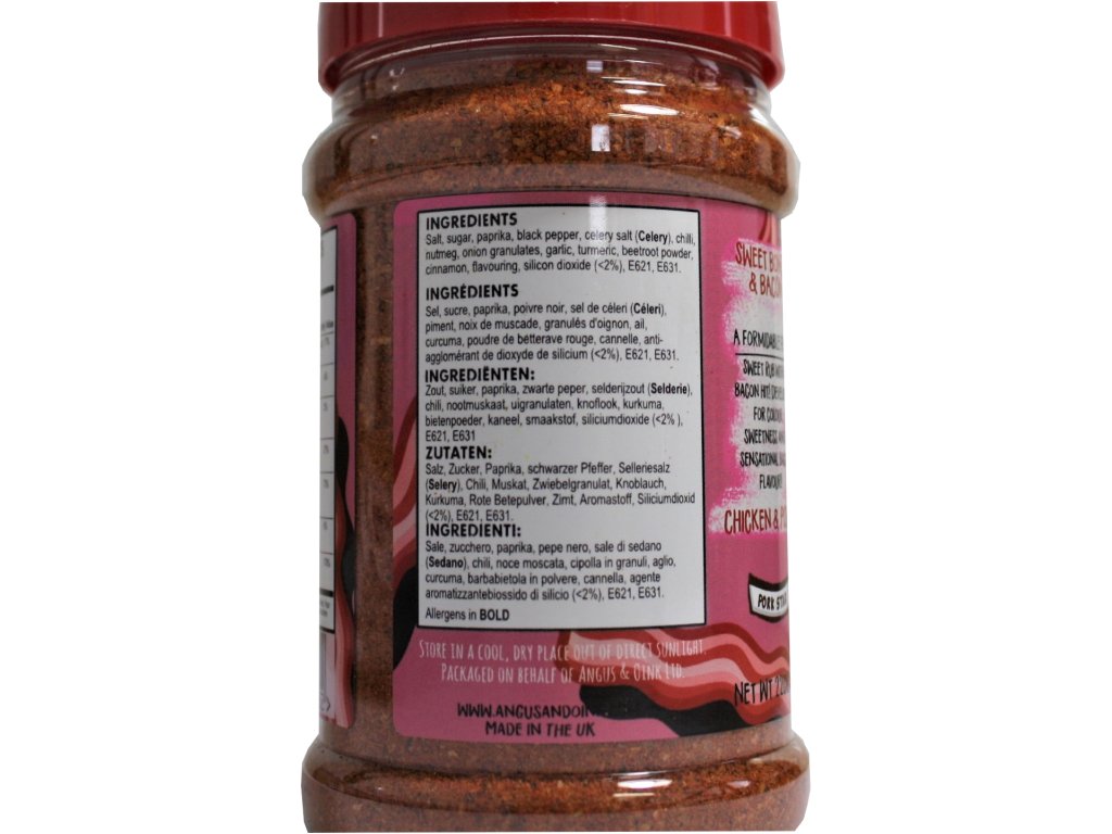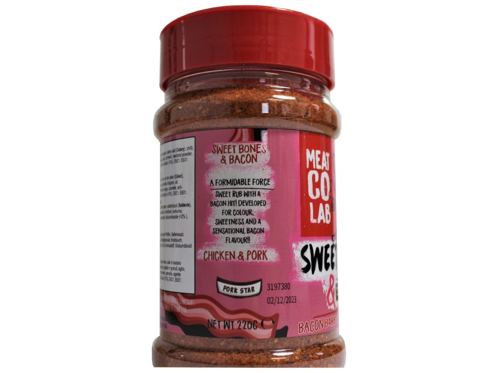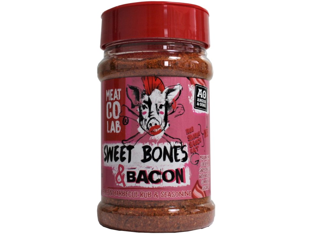 Rub Me Sweet Bones & Bacon Angus&Oink BBQ korenie je skvelé na kuracie a bravčové mäso Zloženie: cukor, soľ, paprika, čierne korenie, zelerová soľ,...