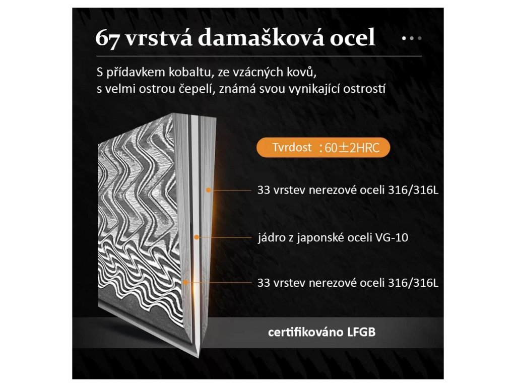✅ Nôž z japonskej damaškovej ocele nepoužívajte na krájanie tvrdých alebo mrazených potravín. Môžete zlomiť čepeľ alebo odlomiť časť čepele.