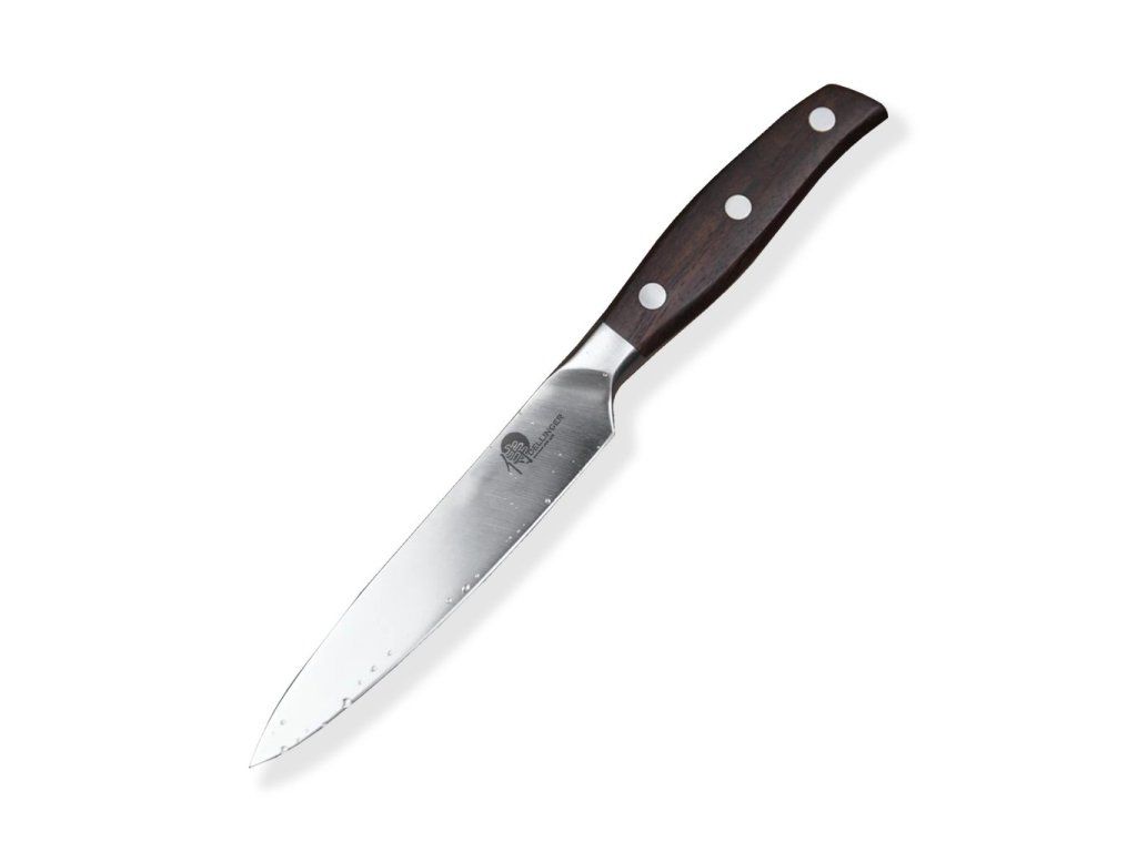 Veľmi ostrý nôž Utility 5“ Dellinger CLASSIC Sandal Wood ( dĺžka čepele 125 mm ) z nemeckej ocele DIN 1.4116 o tvrdosti HRC 56-58 s pôsobivým dizajnom a najvyššou kvalitou je užitočnou alternatívou veľkého šéfkuchárskeho noža v okamihu, keď potrebujete presné rezy, alebo napríklad krájanie zelených fazuliek alebo inej menšej zeleniny a ovocia. Sú vhodné tiež na špikovanie a krájanie mäsa. Zaoblené ostrie umožňuje mierne kývanie pri reze. Jeho ostrosť je ideálna na prípravu sendvičov všetkého druhu. Rukoväť západného typu s 3 nitmi Vám poskytne tú najlepšiu kontrolu pri rezaní a krájaní.
