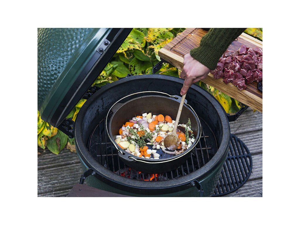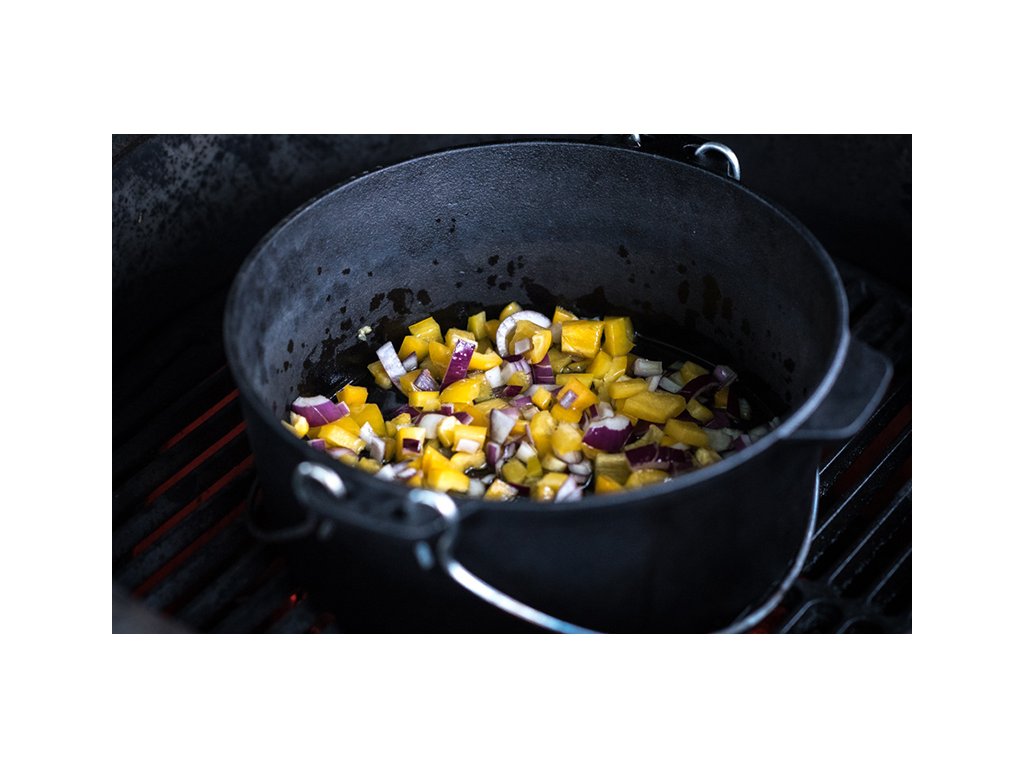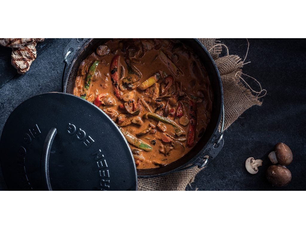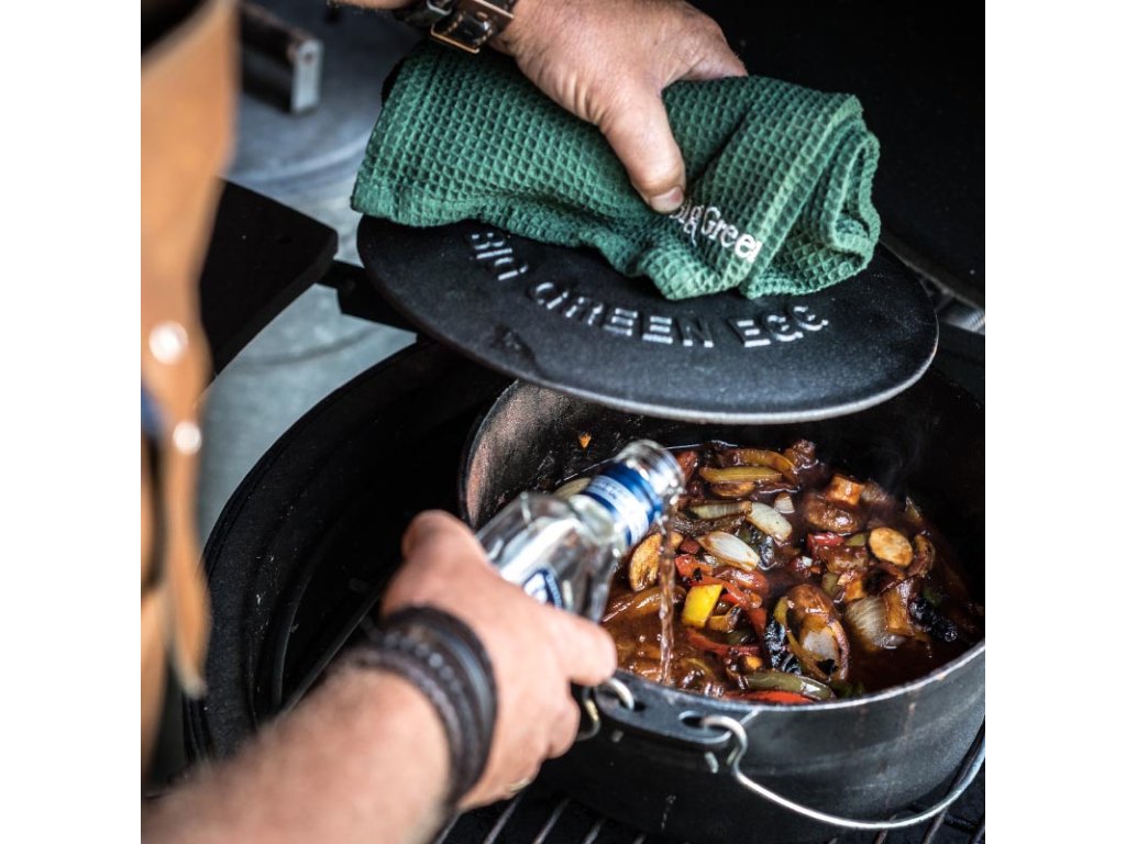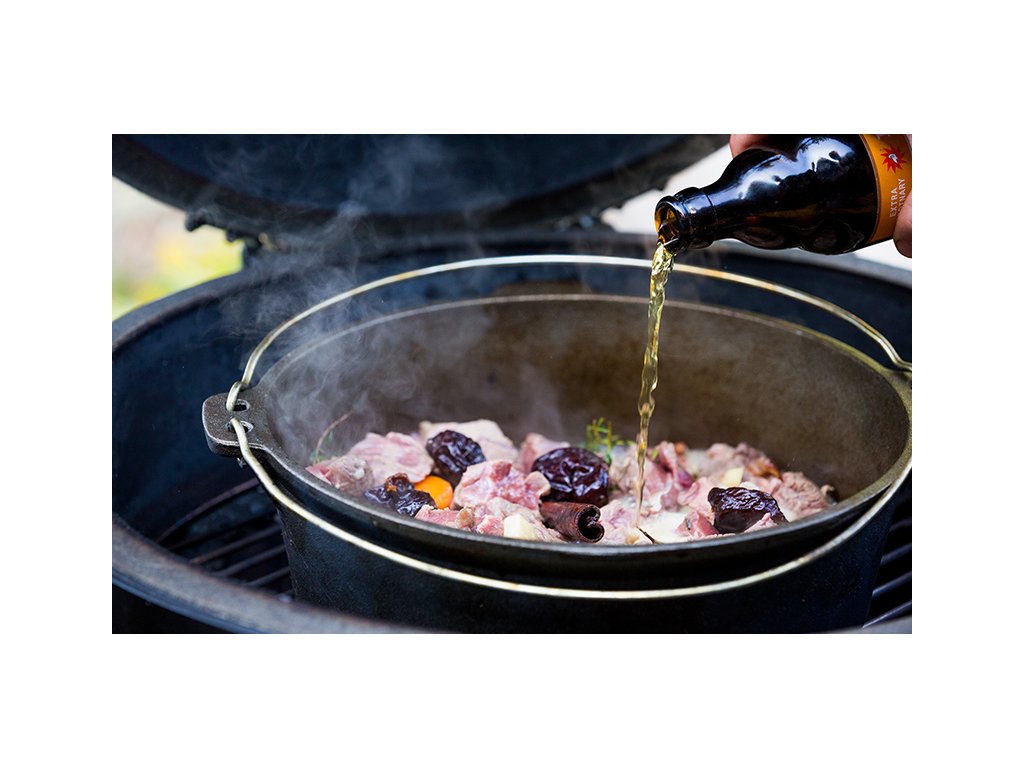 Táto všestranná liatinová holandská rúra vyhráva na všetkých frontoch. Big Green Egg je ideálny na dusené mäso, kaše, nákypy, polievky a všetky jedlá pripravované v jednom hrnci. Liatina rovnomerne rozvádza teplo po celom kotlíku a ťažké veko kotlíka udrží všetku paru vnútri. Alebo môžete použiť kanvicu bez veka a všetky ingrediencie získajú jedinečnú chuť jedla pripraveného na Big Green Egg. Guláš zostane vždy úžasne šťavnatý a jemný. Ste zvedaví? Potom sa vráťte o 4 hodiny...