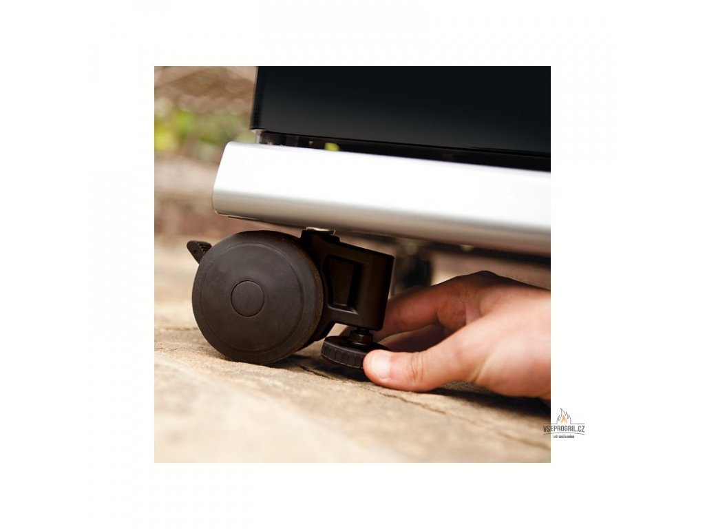 Gril má 4 aretované kolieska, predné kolieska sú doplnené aretačnou skrutkou na vyrovnanie grilu na nerovnom teréne.