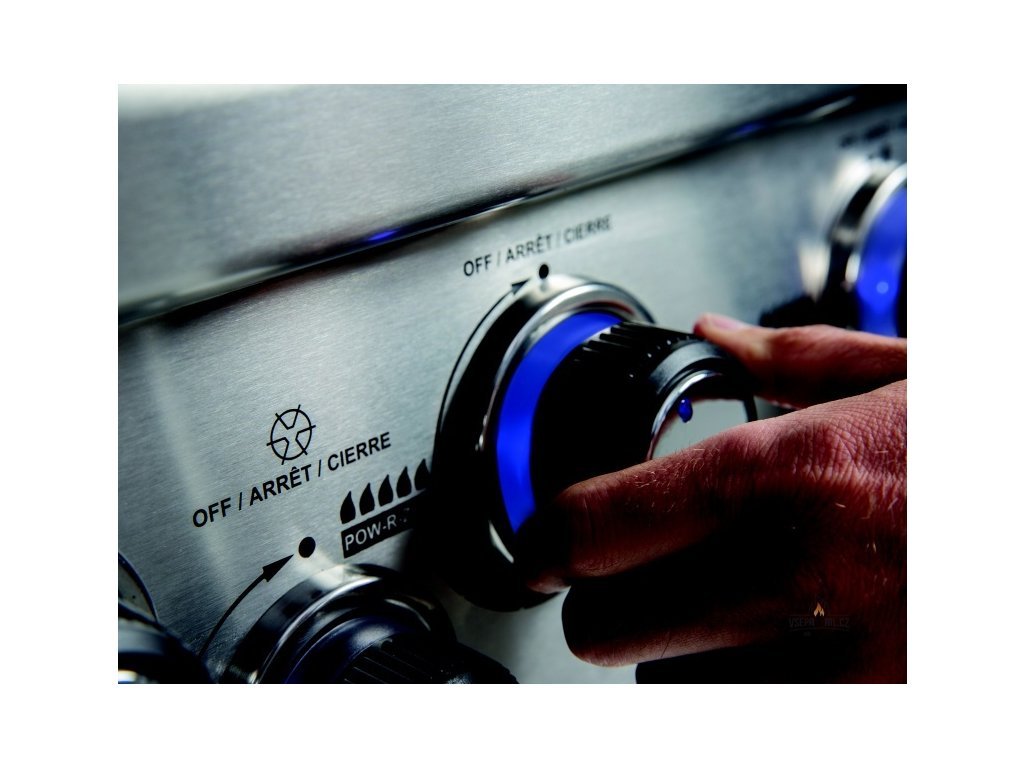 Každý horák má samostatné ovládanie na optimálne nastavenie výkonu prostredníctvom jemného nastavenia s modro podsvieteným ovládacím gombíkom. Na kontrolu teploty slúži priehľadný teplomer vo veku grilu.